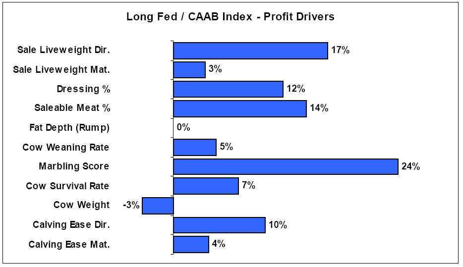 Table 1 also provides the relative economic values, which indicate the importance of each trait for breeding for intended market, taking into account the scope for genetic improvement (ie heritability). In this example, for a Bos taurus breed supplying a high quality export market, marble score is most important, then weaning rate, calving ease and sale weight. Trait importance can change for different production systems and market endpoints. It can also differ among breeds addressing similar markets. These relative values are often depicted graphically (Figure 1). These graphical representations of trait importance for all breed indexes are available on the BreedObject website: www.breedobject.com
