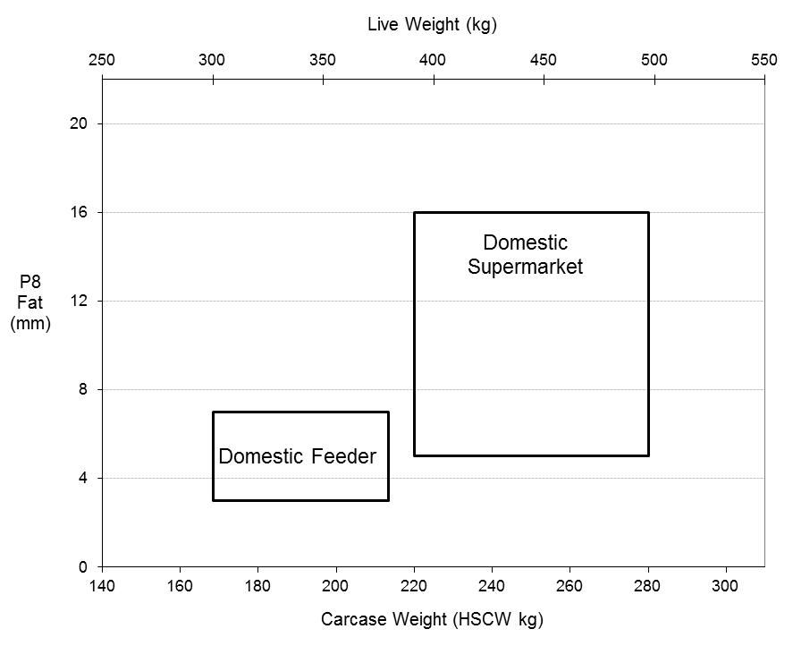 Well-defined specifications have existed for many years for Australian cattle targeted at particular market endpoints. The primary carcase parameters have been hot carcase weight, age (teeth) and P8 fat depth, with values outside preferred ranges attracting discounts from processors. Carcase grids containing the discounts can be obtained from meat processors.