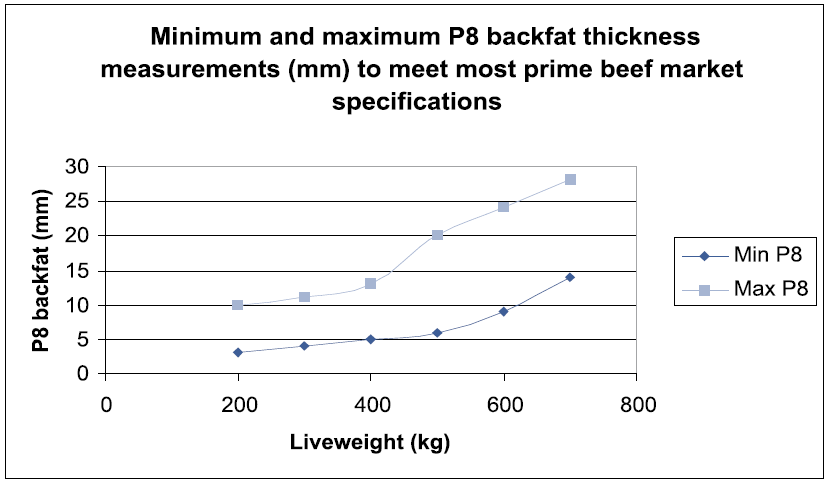 Graph 2: Minimum and maximum P8 backfat thickness measurements (mm) to meet most prime beef market specifications