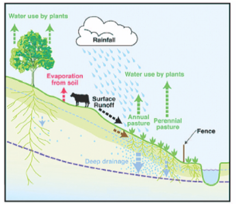 The amount of water vegetation uses determines how much water goes into deep drainage. Annual pasture species and crops use the least amount of water. Perennial plants use more water due to their longer periods of growth.