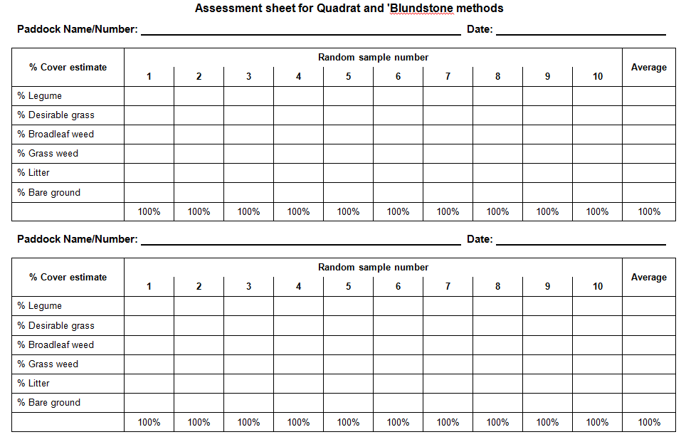 - Take at least five random estimates from five different parts of the paddock for a reliable guide to your pasture’s composition
