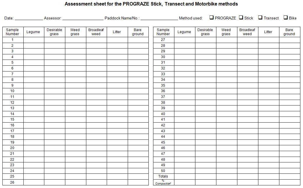 Open PDF to print below: Assessment sheet for the PROGRAZE Stike Transect and Motorbike methods.pdf