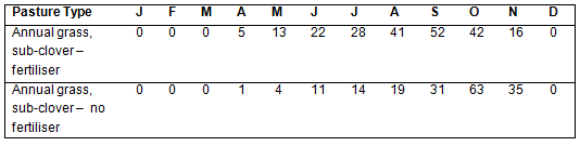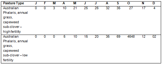 Estimated daily pasture growth rate (mid-month) of specific pasture types (kg DM/ha/day)